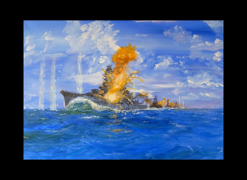 Wayne Scarpaci is a Turner for our times. His paintings are portals into naval history, rich in light and color, and succeed in tugging at our imagination. Thanks to his labors, we have glimpsed the infernal explosion on the Kongo in a line of Japanese capital ships—a painting used for the cover of James Young’s Collisions of the Damned. In another piece, the attack carrier Lexington cruises through the Pacific with fighters overhead and a Regulus missile on her deck. Then there are his paintings dedicated to his favorites—the battleships and battlecruisers—with leviathans like Vanguard at Gibraltar, New York in the Panama Canal, and Alaska guarding the ruined carrier Franklin off Japan.