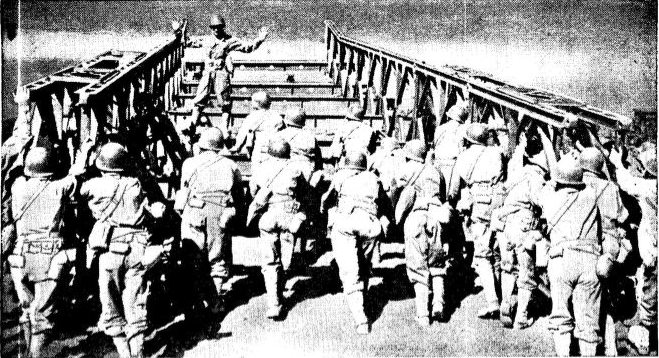 The 617th Engineer Company went to work on a demonstration of a Bailey bridge, named after Sir Donald Coleman Bailey, whose invention provided a sturdy, temporary span for military vehicles and troops. The bridge was made up of trusses. Each truss was ten by three feet in dimension and weighed a whopping 576 pounds. The pieces could be set side by side or on top of one another, and they could be joined with a floating bridge. Babcock explained that “Capacity is variable and a function of the length and complexity of the design” and depended on how many trusses the engineers would use on the job. A Bailey bridge made out of pontoons was once constructed in a 4,000-foot span over the Maas River in the Netherlands, and a combination float and Bailey bridge was built over the Rhine in Germany.